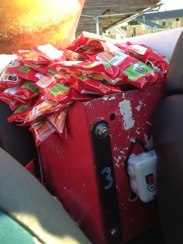 Rendez-vous est pris avec l'équipe St.Michel à Beauvoir à 6h50. Aujourd'hui, c'est un contre la montre individuel. Les coureurs s'élançant un par un sur les 33 km d'Avranches au Mont Saint Michel, la caravane doit partir dès 8h40. L'inquiétude c'est de ne pas rejoindre à temps le PPO (point de passage obligatoire), pour intégrer la caravane. Les véhicules sont alignés sur un parking technique en contrebas d'Avranches. Les membres de la caravane St.Michel s'affairent à remplir les véhicules de 350 cartons de madeleines. L'étape est un peu plus simple que les autres car avec une si courte distance à parcourir il n'y a pas de "réappro" à effectuer. Cela-dit, l'équipe fatigue un peu. Depuis quelques jours les équipiers se lèvent entre 5 et 6h00 du matin. Certains misent sur le couple café/guronsan d'autres sont plutôt vitamines. Pour se réveiller et se mettre en action, la tradition est de faire la"choré" de la caravane Alcatel. Les équipiers des différents annonceurs se saluent. On se connait. Faut dire aussi que la plupart des caravanes dont gérées par l'agence IDactif. La journée est importante pour St.Michel qui a une usine à Avranches. Cette étape devient une opé de communication interne. Les salariés de l'usine ne travaillent pas aujourd'hui. Ils sont invités à la biscuiterie de la baie du Mont. Benjamin, le responsable de la caravane, décide en Briefing de marquer un stop devant les collaborateurs.